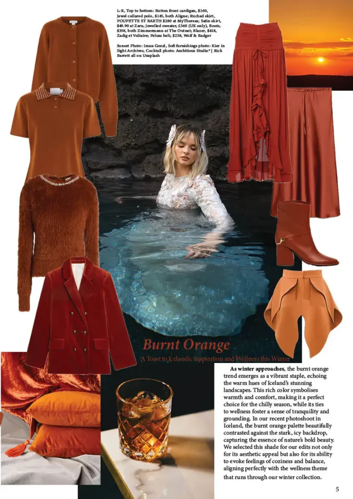 In our recent photoshoot in Iceland, the burnt orange palette was expertly showcased against the stark, icy backdrop. The contrast between the rich, earthy tones and the crisp winter scenery perfectly captured the essence of nature’s bold beauty. Each frame highlighted the harmony between the warmth of burnt orange and the serene, icy surroundings, creating a visual narrative that is as inspiring as it is stunning.